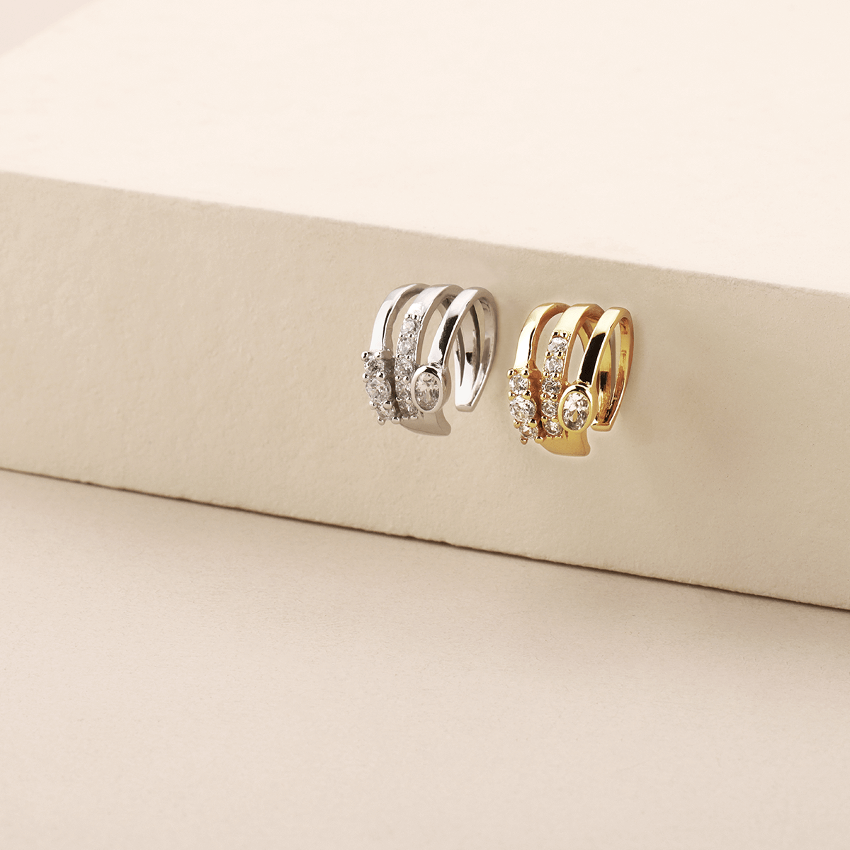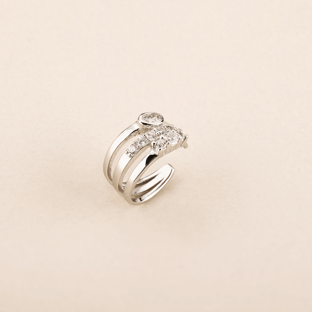 Aus 925/- Sterling Silber gearbeitet, mit Rhodium veredelt, 3reihig designd und zusätzlich mit Zirkonia besetzt, funkelt der Ear Cuff SOLAR STAR an Ihrem Ohr mit dem anderen Ohrschmuck um die Wette.